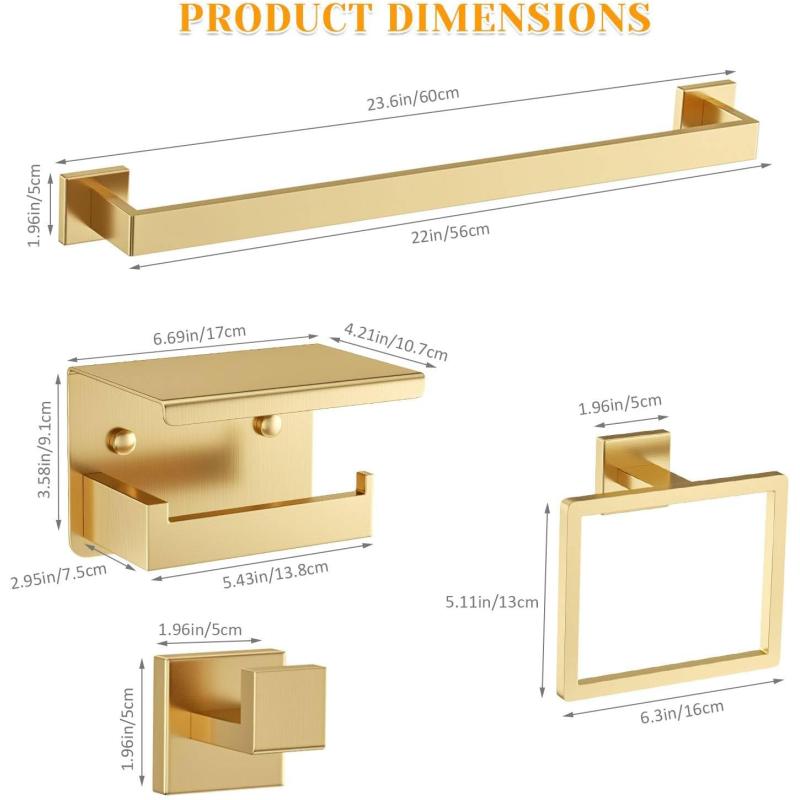 The Brushed Gold 5-Piece Towel Bar Set is the perfect blend of functionality and modern design, bringing an elegant touch to your bathroom. Featuring a premium brushed gold finish, this set elevates your home decor while offering a practical solution for your towel and accessory needs. With its multi-functional toilet paper holder and spacious shelving platform, this set maximizes your bathroom space without compromising on style.